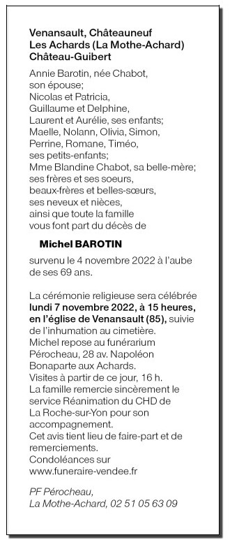 Décédé à La Roche-sur-Yon (85000, France) le vendredi 4 novembre 2022 à l'âge de 68 ans