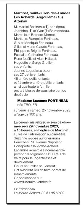 Décédée à Vaire (85150, France) le samedi 25 novembre 2023 à l'âge de 100 ans