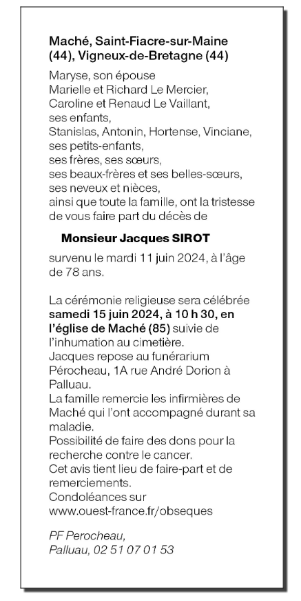 Décédé à Mache (85190, France) le mardi 11 juin 2024 à l'âge de 78 ans