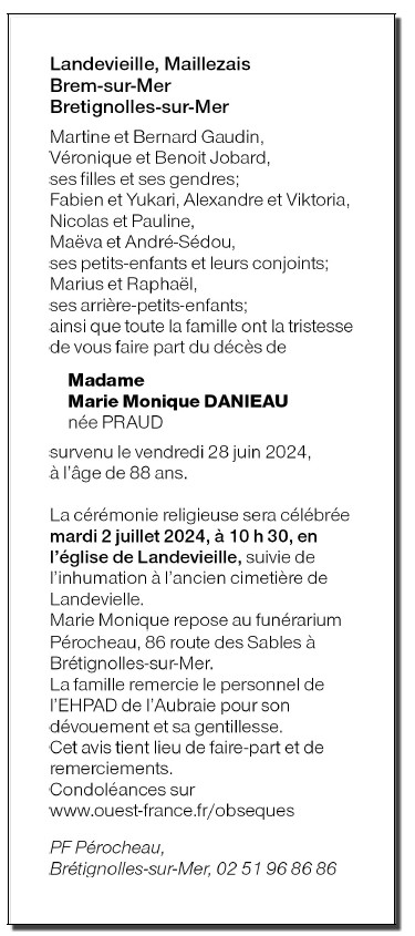 Décédée à Bretignolles-sur-Mer (85470, France) le vendredi 28 juin 2024 à l'âge de 88 ans