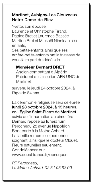 Décédé à Martinet (85150, France) le jeudi 24 octobre 2024 à l'âge de 84 ans