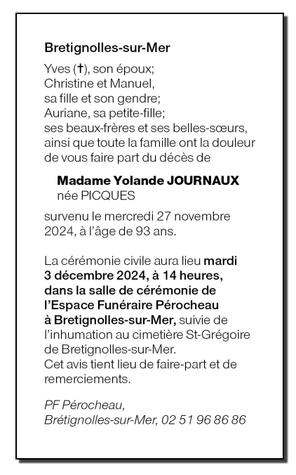 Décédée à Bretignolles-sur-Mer (85470, France) le mercredi 27 novembre 2024 à l'âge de 93 ans