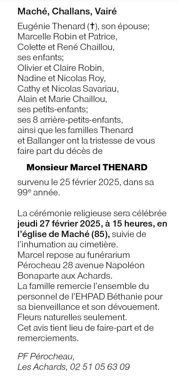 Décédé à Les Achards (85150, France) le mardi 25 février 2025 à l'âge de 98 ans