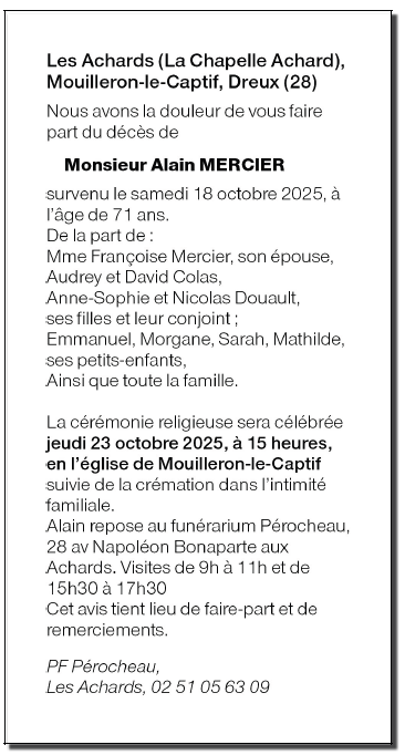 Décédé à Les Achards (85150, France) le samedi 18 octobre 2025 à l'âge de 71 ans