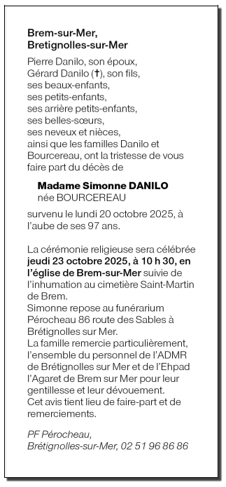 Décédée à Brem-sur-Mer (85470, France) le lundi 20 octobre 2025 à l'âge de 96 ans