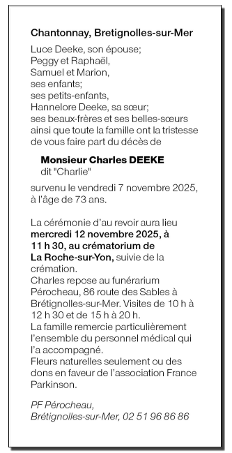 Décédé à Challans (85300, France) le vendredi 7 novembre 2025 à l'âge de 73 ans