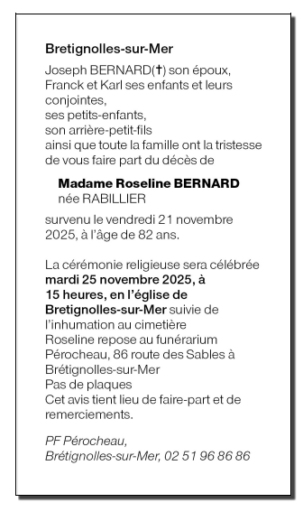 Décédée à Les Sables-d'Olonne (85340, France) le vendredi 21 novembre 2025 à l'âge de 82 ans