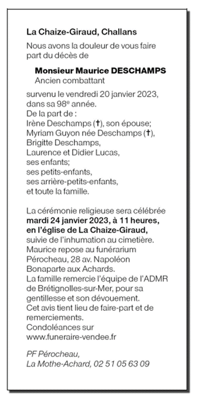 Décédé à La Chaize-Giraud (85220, France) le vendredi 20 janvier 2023 à l'âge de 97 ans