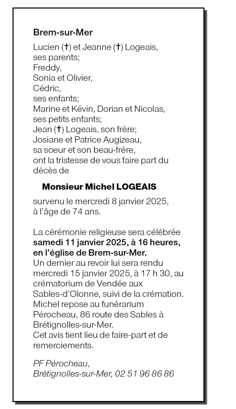 Décédé à Les Sables d'Olonne (85100, France) le mercredi 8 janvier 2025 à l'âge de 74 ans