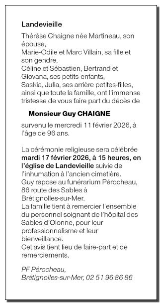Décédé à Les Sables d'Olonne (85340, France) le mercredi 11 février 2026 à l'âge de 96 ans