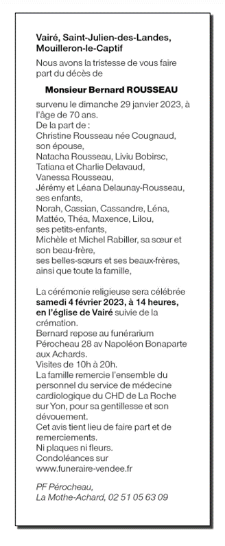 Décédé à La Roche-sur-Yon (85000, France) le dimanche 29 janvier 2023 à l'âge de 70 ans