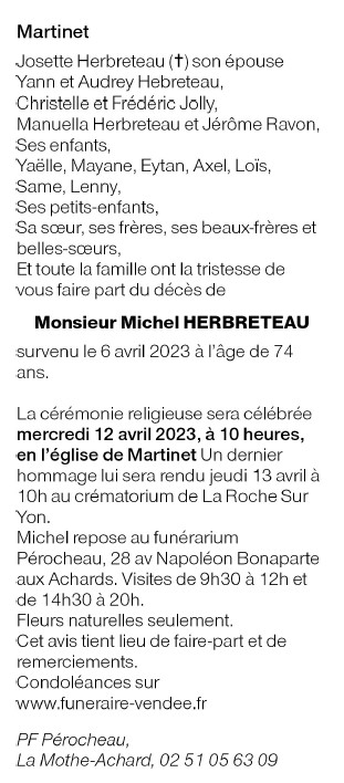 Décédé à Martinet (85150, France) le jeudi 6 avril 2023 à l'âge de 74 ans