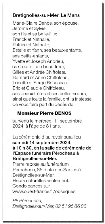 Décédé à Saint-Gilles-Croix-de-Vie (85800, France) le mercredi 11 septembre 2024 à l'âge de 81 ans