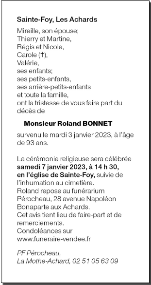 Décédé à Olonne sur Mer (85340, France) le mardi 3 janvier 2023 à l'âge de 93 ans