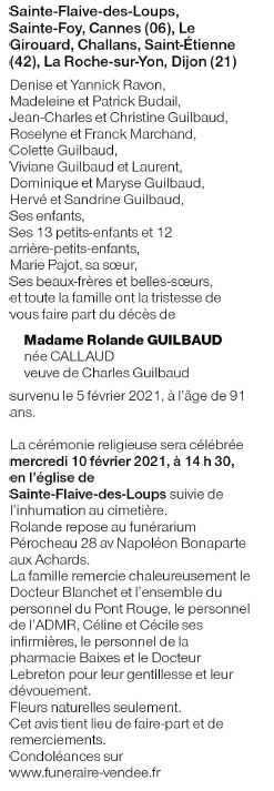Décédée à La Roche-sur-Yon (85000, France) le vendredi 5 février 2021 à l'âge de 91 ans
