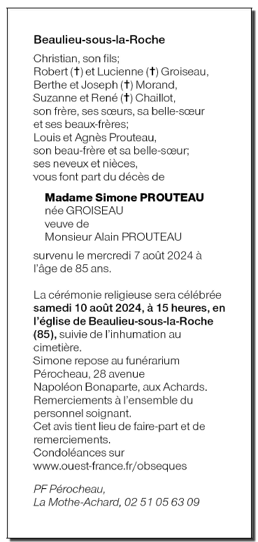 Décédée à Beaulieu-sous-la-Roche (85190, France) le mercredi 7 août 2024 à l'âge de 85 ans