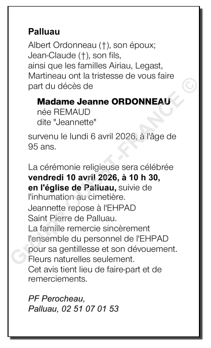 Née à Palluau (85670, France) le mercredi 6 août 1930