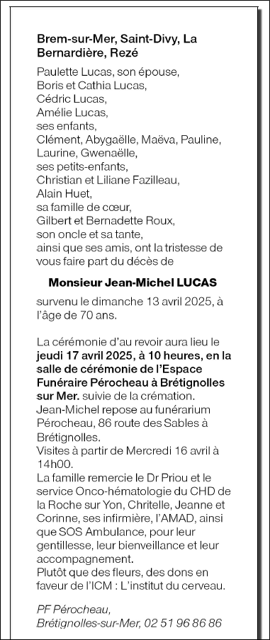 Décédé à Brem-sur-Mer (85470, France) le dimanche 13 avril 2025 à l'âge de 70 ans