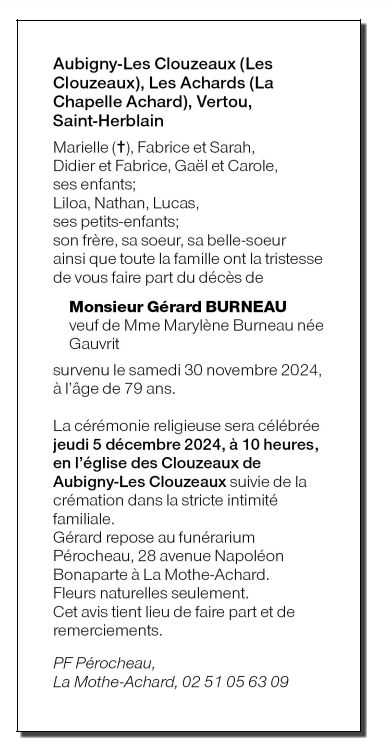 Décédé à Aubigny (85430, France) le samedi 30 novembre 2024 à l'âge de 79 ans