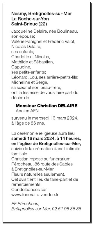 Décédé à Bretignolles-sur-Mer (85470, France) le mercredi 13 mars 2024 à l'âge de 86 ans