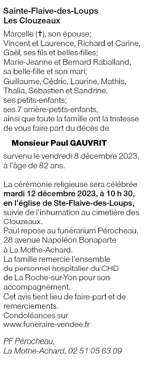 Né à Les Clouzeaux (85430, France) le mercredi 29 janvier 1941
