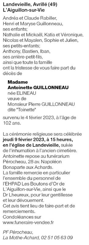 Madame Irène Antoinette GUILLONNEAU née ELINEAU