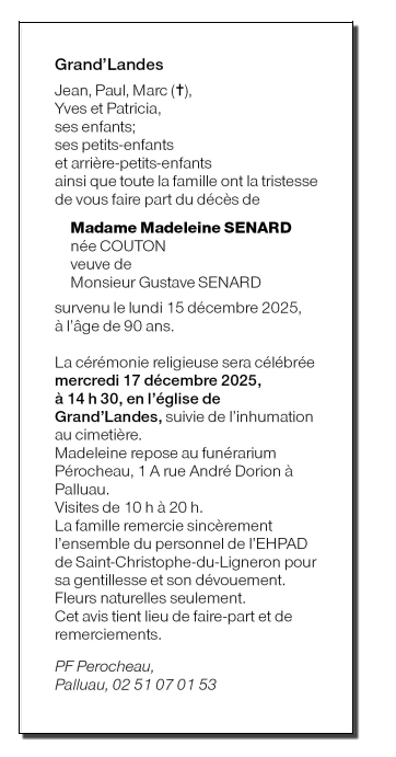 Décédée à Saint-Christophe-du-Ligneron (85670, France) le lundi 15 décembre 2025 à l'âge de 90 ans
