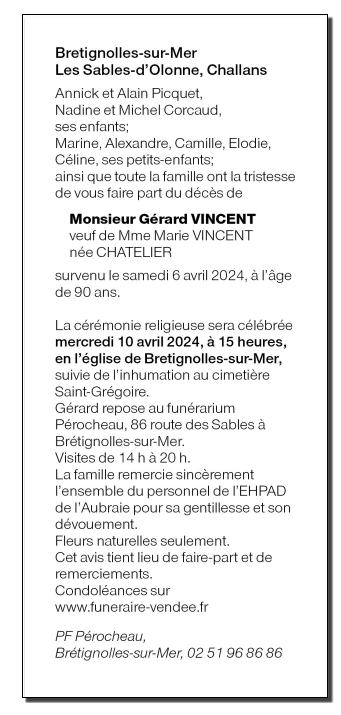Décédé à Les Sables d'Olonne (85100, France) le samedi 6 avril 2024 à l'âge de 90 ans