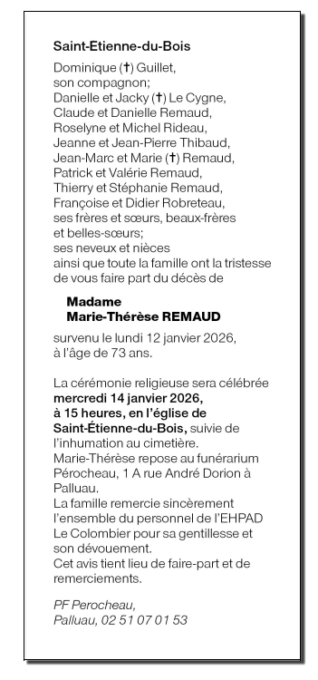 Décédée à Saint-Étienne-du-Bois (85670, France) le lundi 12 janvier 2026 à l'âge de 73 ans