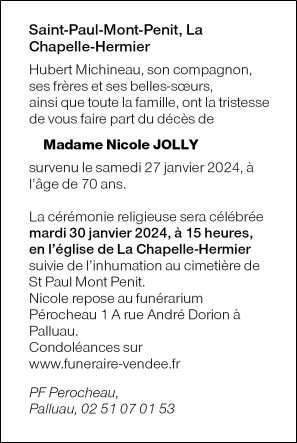 Décédée à Saint-Paul-Mont-Penit (85670, France) le samedi 27 janvier 2024 à l'âge de 70 ans