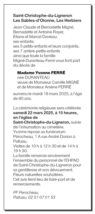 Décédée à Saint-Christophe-du-Ligneron (85670, France) le mardi 18 mars 2025 à l'âge de 90 ans