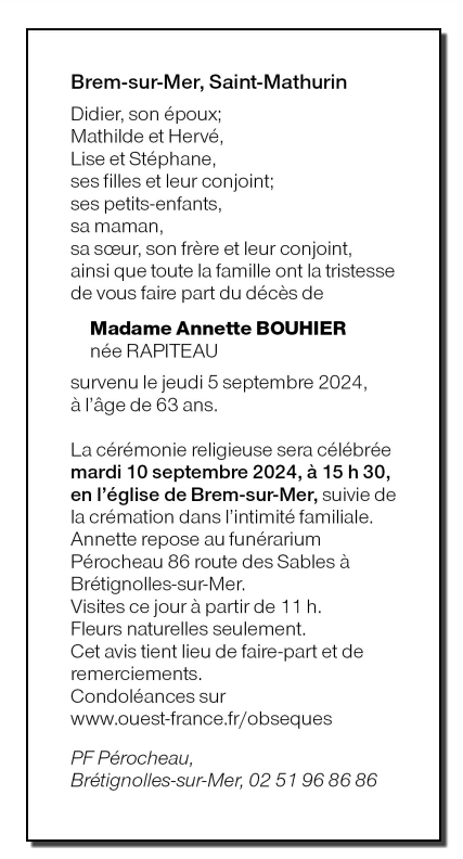 Décédée à Brem-sur-Mer (85470, France) le jeudi 5 septembre 2024 à l'âge de 63 ans
