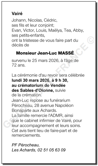 Décédé à Les Sables d'Olonne (85100, France) le mercredi 25 mars 2026 à l'âge de 72 ans
