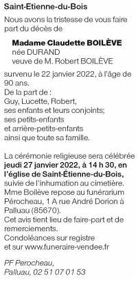 Décédée à Challans (85300, France) le samedi 22 janvier 2022 à l'âge de 90 ans