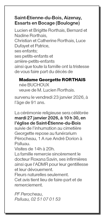 Décédée à Saint-Étienne-du-Bois (85670, France) le vendredi 23 janvier 2026 à l'âge de 91 ans