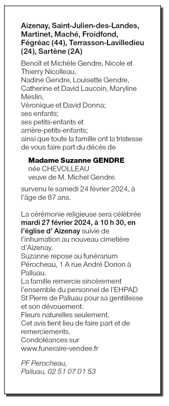 Madame Suzanne GENDRE née CHEVOLLEAU