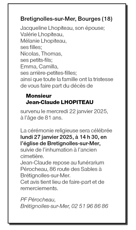 Décédé à Bretignolles-sur-Mer (85470, France) le mercredi 22 janvier 2025 à l'âge de 81 ans