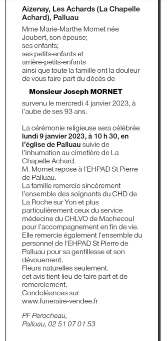 Décédé à Machecoul (44270, France) le mercredi 4 janvier 2023 à l'âge de 92 ans