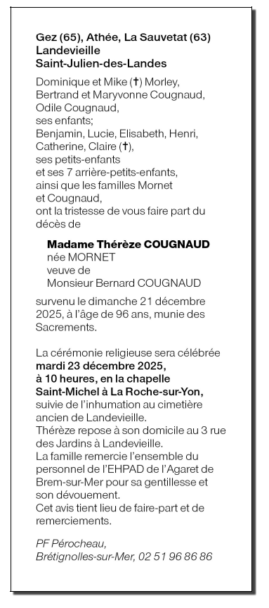 Décédée à Brem-sur-Mer (85470, France) le dimanche 21 décembre 2025 à l'âge de 96 ans