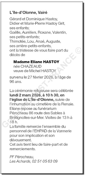 Décédée à Les Sables d'Olonne (85100, France) le vendredi 27 février 2026 à l'âge de 96 ans