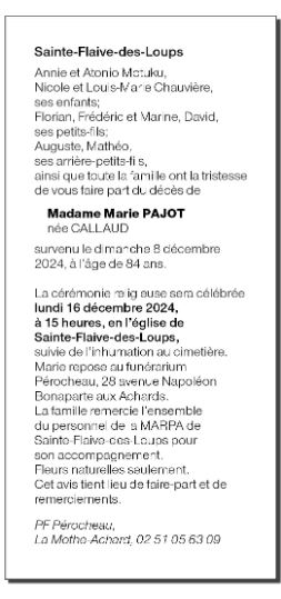 Décédée à Sainte-Flaive-des-Loups (85150, France) le dimanche 8 décembre 2024 à l'âge de 84 ans