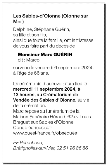 Décédé à Les Sables d'Olonne (85340, France) le vendredi 6 septembre 2024 à l'âge de 66 ans