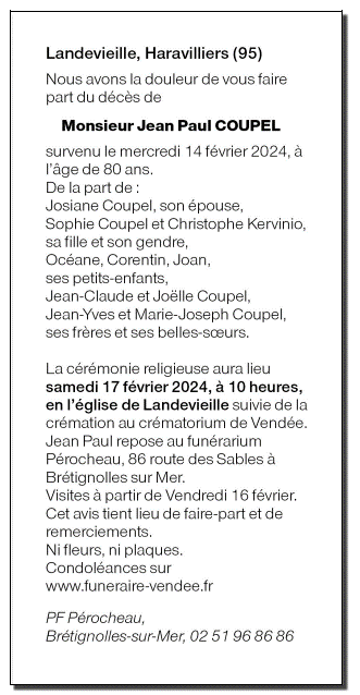 Décédé à Les Sables d'Olonne (85340, France) le mercredi 14 février 2024 à l'âge de 80 ans