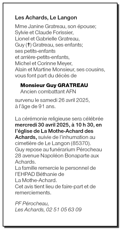 Décédé à La Mothe Achard (85150, France) le samedi 26 avril 2025 à l'âge de 91 ans