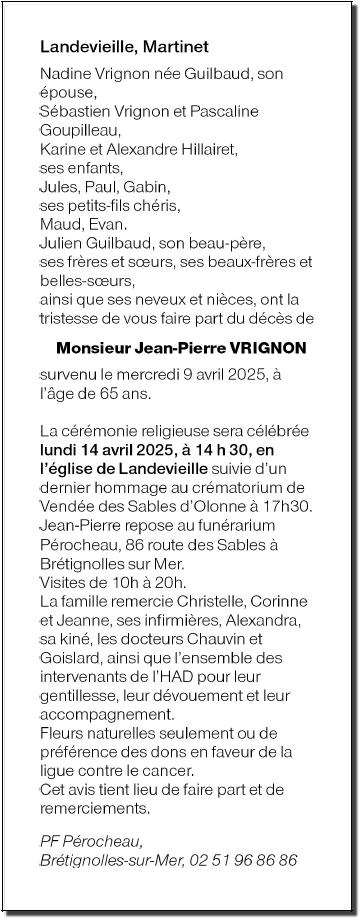 Décédé à Landevieille (85220, France) le mercredi 9 avril 2025 à l'âge de 65 ans