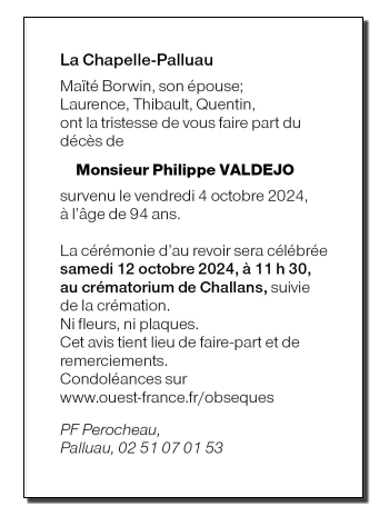 Décédé à Aizenay (85190, France) le vendredi 4 octobre 2024 à l'âge de 94 ans
