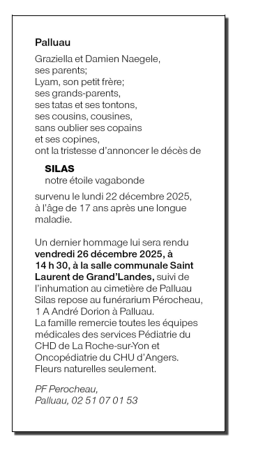 Décédé à La Roche-sur-Yon (85000, France) le lundi 22 décembre 2025 à l'âge de 17 ans