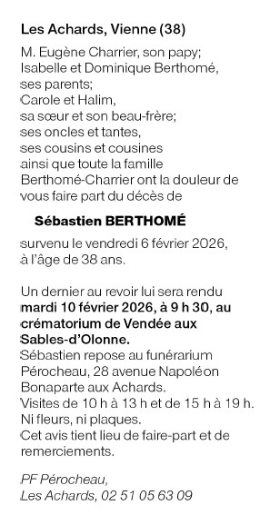 Décédé à Les Achards (85150, France) le vendredi 6 février 2026 à l'âge de 38 ans