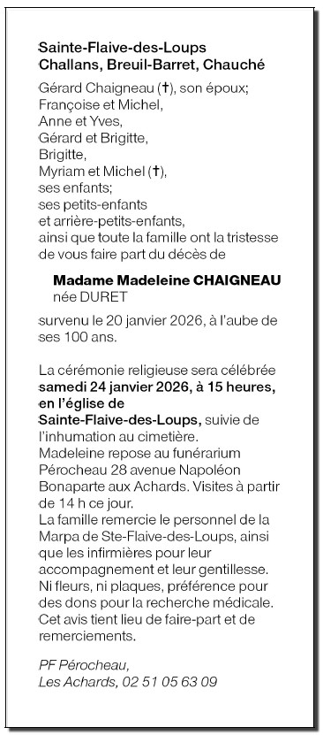 Décédée à Sainte-Flaive-des-Loups (85150, France) le mardi 20 janvier 2026 à l'âge de 99 ans
