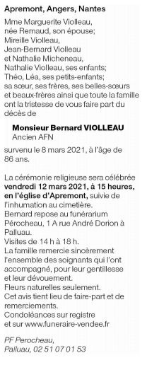 Décédé à La Roche-sur-Yon (85000, France) le lundi 8 mars 2021 à l'âge de 86 ans